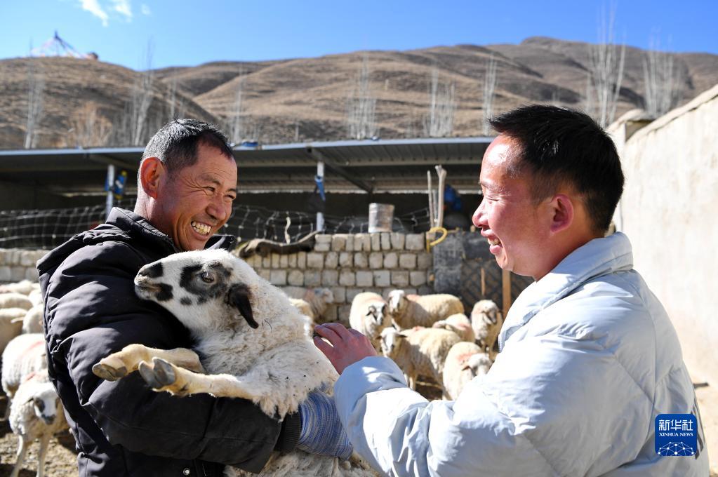西卡學(xué)村養(yǎng)殖合作社負責(zé)人邊覺(左)在向西卡學(xué)村黨總支第一書記兼駐村工作隊副隊長李德林介紹綿羊養(yǎng)殖及銷售情況(4月5日攝)。新華社記者 張汝鋒 攝