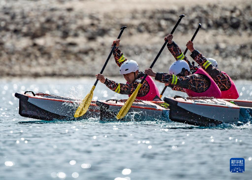 4月15日,選手們在200米靜水漂流筏排位賽中。新華社記者 孫非 攝