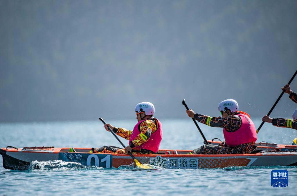 4月15日,選手們在200米靜水雙人漂流艇競速賽中(無人機照片)。新華社記者 孫非 攝