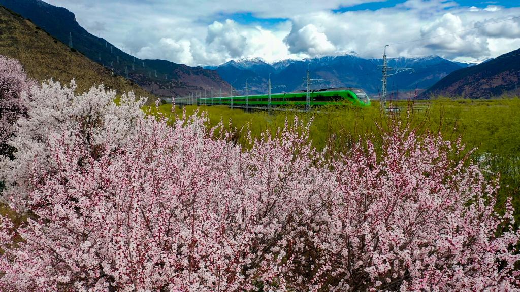復興號列車行駛在兩側(cè)桃花盛開的拉林鐵路上(無人機照片,3月25日攝)。新華社記者姜帆 攝