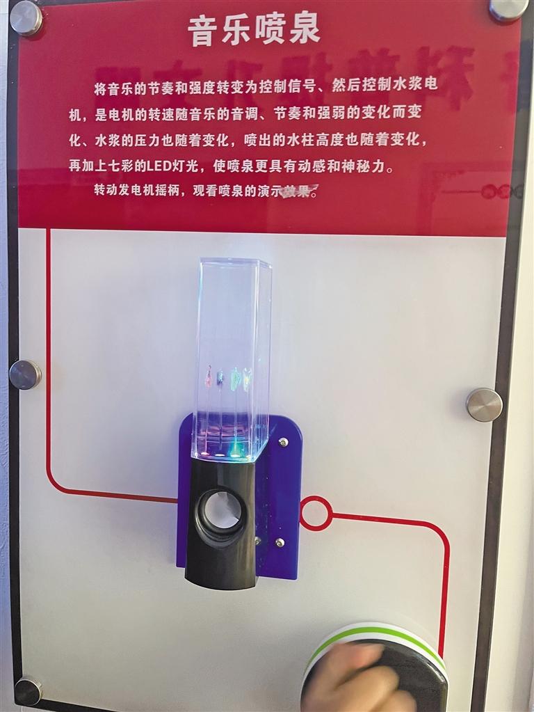 在科技體驗(yàn)區(qū),一個(gè)巨大的水龍頭吸引了所有人的目光,這個(gè)水龍頭在沒(méi)有支撐的情況下竟然漂浮在空中,一股不知從哪里來(lái)的水源源不斷地從水龍頭中流出。在索央的引導(dǎo)下,小朋友輪流去觸摸水流,發(fā)現(xiàn)支撐水龍頭的是一根透明的水管,被流下的水流遮擋,水管把水輸送到水龍頭,再讓水從外面流下,看起來(lái)就好像一股從天而降的水柱。