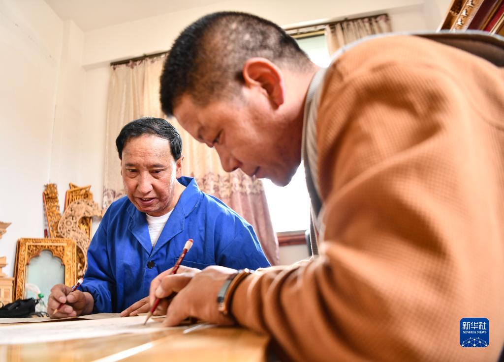 拉巴次仁(左)指導徒弟繪制木雕模板草圖(4月25日攝)。新華社記者 晉美多吉 攝