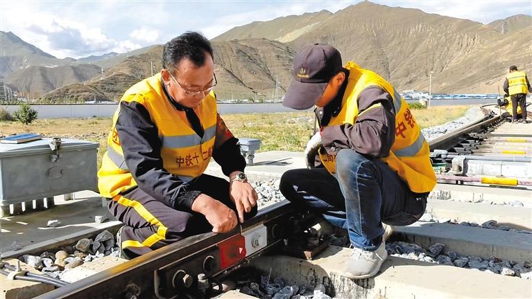 5月1日,2023年“西藏五一勞動(dòng)獎(jiǎng)?wù)隆鲍@得者劉祥斌(左)和同事在青藏鐵路拉薩工區(qū)巡檢鐵路。李洲 攝