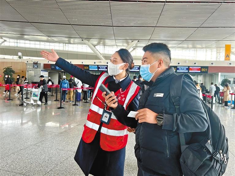 5月1日,拉薩貢嘎機(jī)場(chǎng)旅服部工作人員在給旅客指引方向。扎西頓珠 羅珍 攝