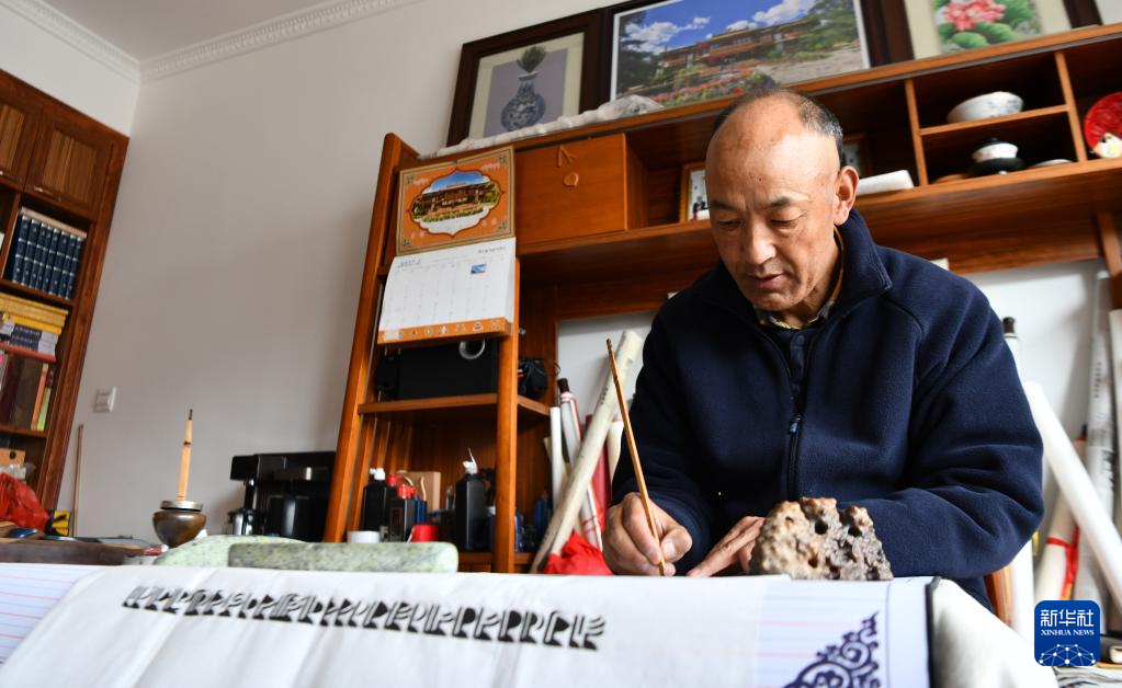 久米次成在家中撰寫梵文書(shū)法(4月19日攝)。新華社記者 晉美多吉 攝