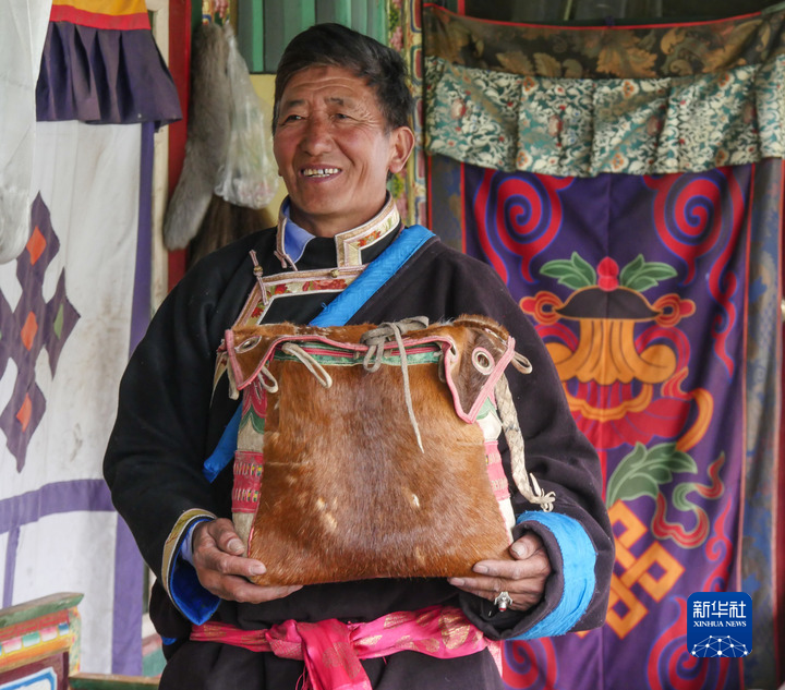 索朗群培展示他制作的馬包(4月18日攝)。新華社記者 晉美多吉 攝