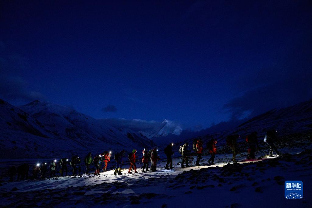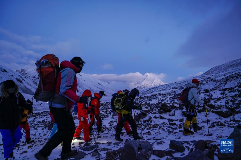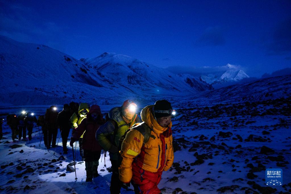 5月3日,登山愛(ài)好者在凌晨出發(fā),開始攀登海拔6010米的洛堆峰。新華社記者 孫非 攝