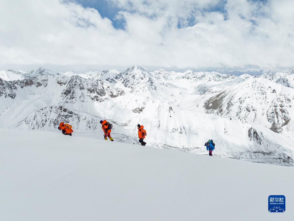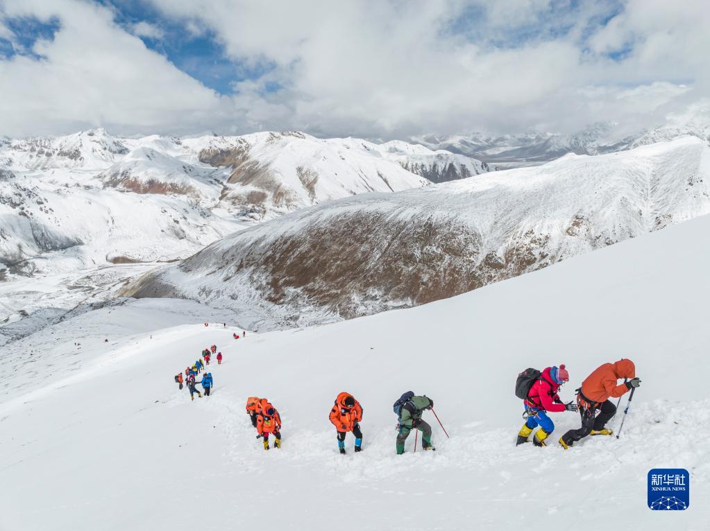 5月3日,登山愛(ài)好者正在向海拔6010米的洛堆峰峰頂進(jìn)發(fā)(無(wú)人機(jī)照片)。新華社記者 孫非 攝