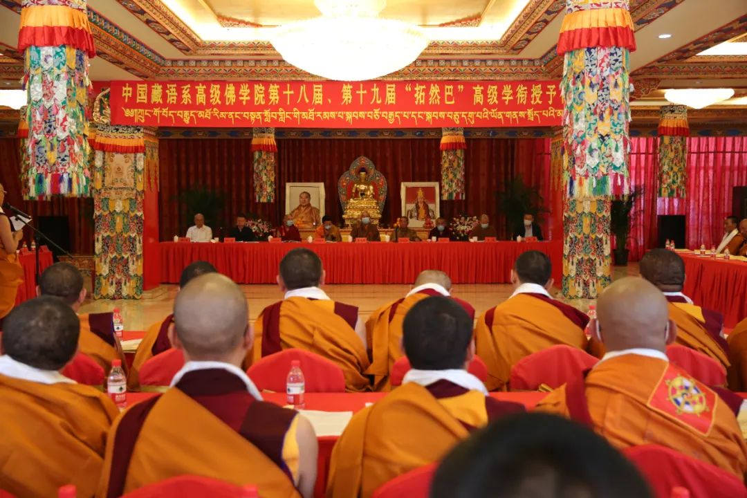 5月23日,藏傳佛教第十八屆、十九屆“拓然巴”高級(jí)學(xué)銜授予儀式在北京中國(guó)藏語(yǔ)系高級(jí)佛學(xué)院舉行。來(lái)自藏傳佛教格魯派、寧瑪派、薩迦派、噶舉派、苯波派的62名學(xué)員,經(jīng)過(guò)3年刻苦學(xué)習(xí),圓滿完成學(xué)業(yè),取得中國(guó)藏語(yǔ)系高級(jí)佛學(xué)院高級(jí)學(xué)銜班畢業(yè)證書。經(jīng)過(guò)嚴(yán)格的資格審查、辯經(jīng)考試、論文答辯,62名學(xué)員全部獲得藏傳佛教“拓然巴”高級(jí)學(xué)銜。