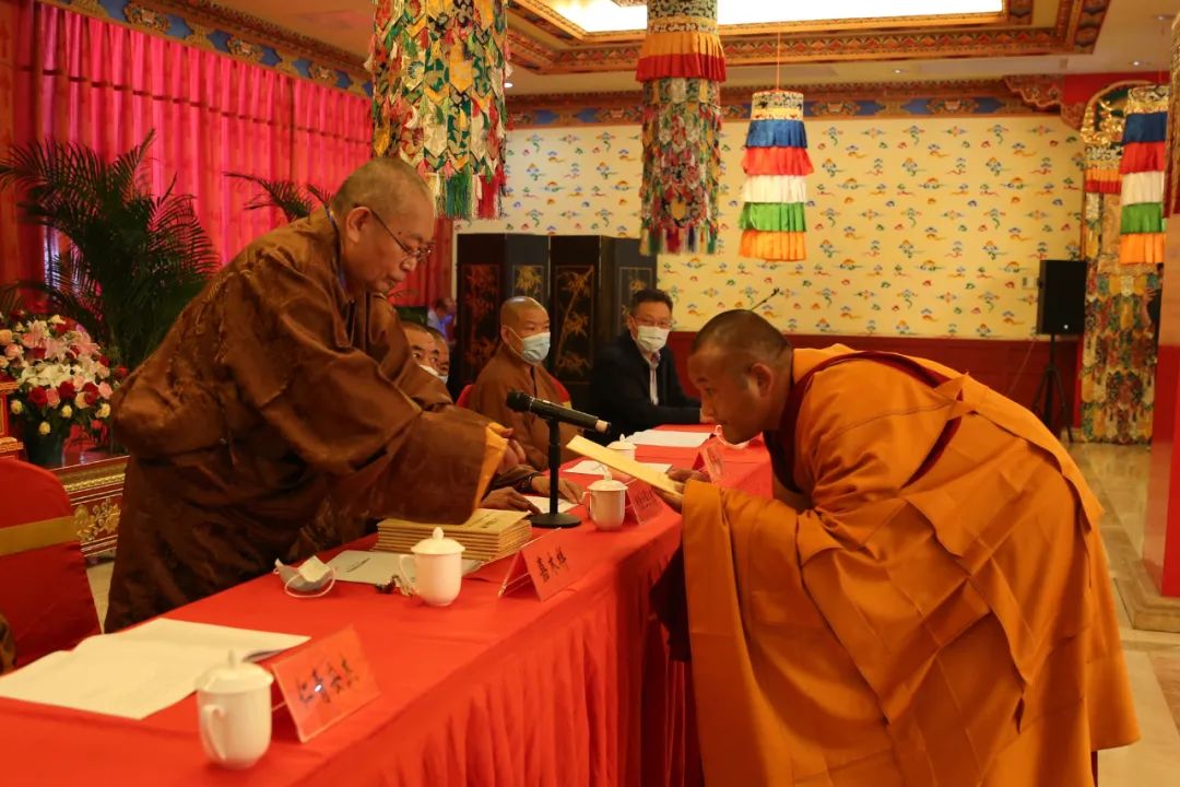 中國(guó)佛教協(xié)會(huì)副會(huì)長(zhǎng)、藏傳佛教學(xué)銜工作指導(dǎo)委員會(huì)主任、中國(guó)藏語(yǔ)系高級(jí)佛學(xué)院院長(zhǎng)嘉木樣活佛向“拓然巴”高級(jí)學(xué)銜獲得者頒發(fā)學(xué)銜證書。中國(guó)佛教協(xié)會(huì)副會(huì)長(zhǎng)、藏傳佛教學(xué)銜工作指導(dǎo)委員會(huì)副主任珠康·土登克珠活佛向“拓然巴”高級(jí)學(xué)銜獲得者表示祝賀。