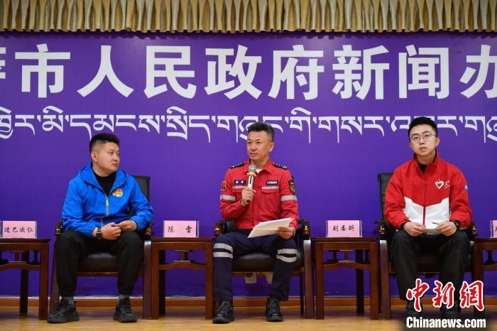 圖為拉薩市青年志愿救援隊代表陳雷(中)正在分享志愿服務(wù)經(jīng)歷?!∝暩聛硭?攝