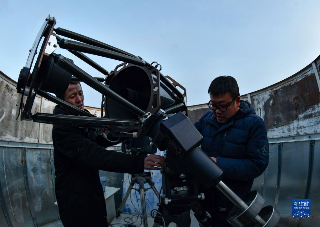 尤顯龍(左)和同事唐鵬在調試望遠鏡(5月23日攝)。新華社記者 晉美多吉 攝