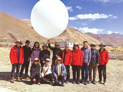 “我們選擇了對水汽通道進行觀測研究,首先就要進行實地考察。喜馬拉雅山脈中段有數(shù)條河谷,水汽很可能是通過河谷進入青藏高原。大氣小分隊選取珠峰東坡的嘎瑪溝進行考察,開展臨時機動觀測對這個設想進行驗證。之后,在嘎瑪溝兩端的曲當鄉(xiāng)和陳塘鎮(zhèn),架設了兩個自動氣象站和兩套水汽探測系統(tǒng),并在曲當鄉(xiāng)開展了無線電氣球探空試驗?!崩蠲平榻B。