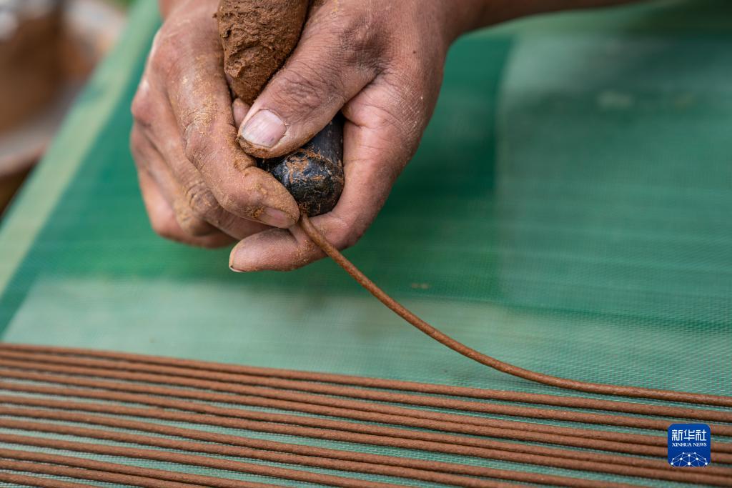 在西藏尼木縣吞巴鎮(zhèn)吞達村,次仁多吉將柏木漿制作成香磚(6月9日攝)。新華社記者 孫非 攝