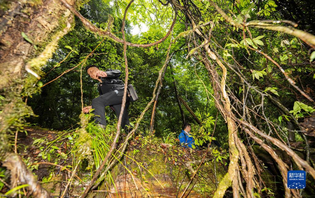 6月15日,波密縣林草局工作人員西繞(左)帶領大家穿過原始森林尋找亞洲第一高樹。新華社記者 費茂華 攝