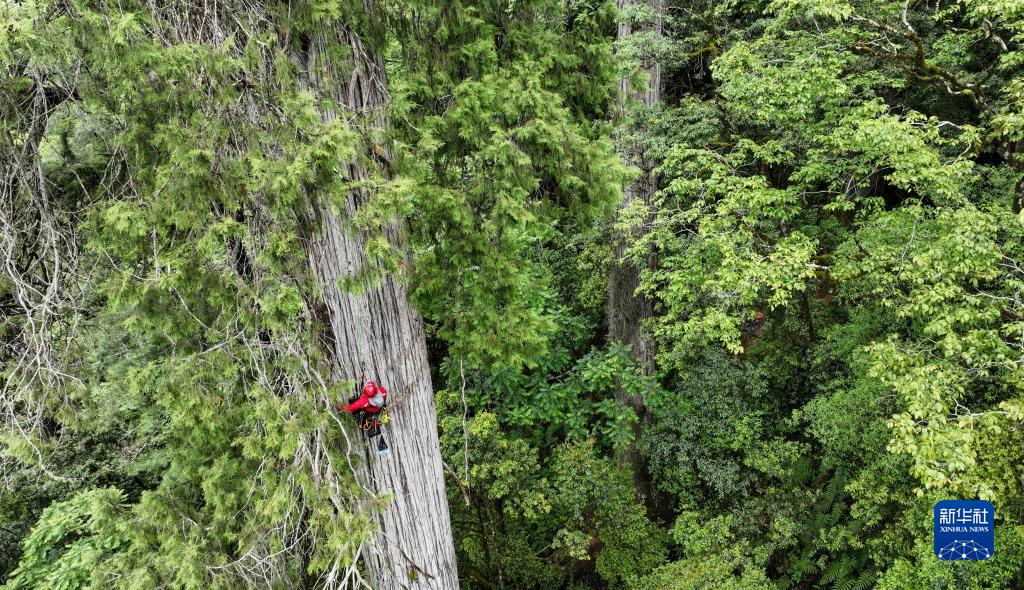 6月15日,攀樹專家劉團璽在攀爬亞洲第一高樹(無人機照片)。新華社記者 晉美多吉 攝