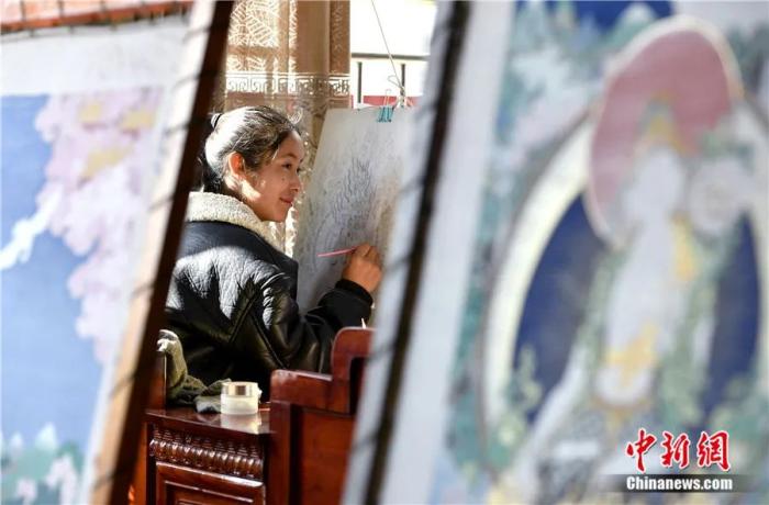 索朗次旺在西藏拉薩繪制唐卡。隨著社會(huì)的發(fā)展,越來(lái)越多的西藏女性學(xué)習(xí)唐卡繪畫(huà)。李林 攝