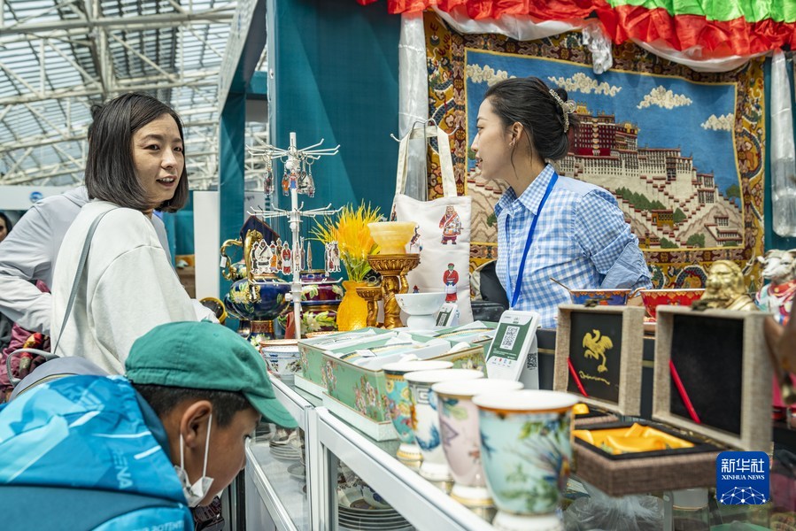 在第五屆“藏博會”現(xiàn)場,參觀者在挑選商品(6月18日攝)。新華社記者 孫非 攝