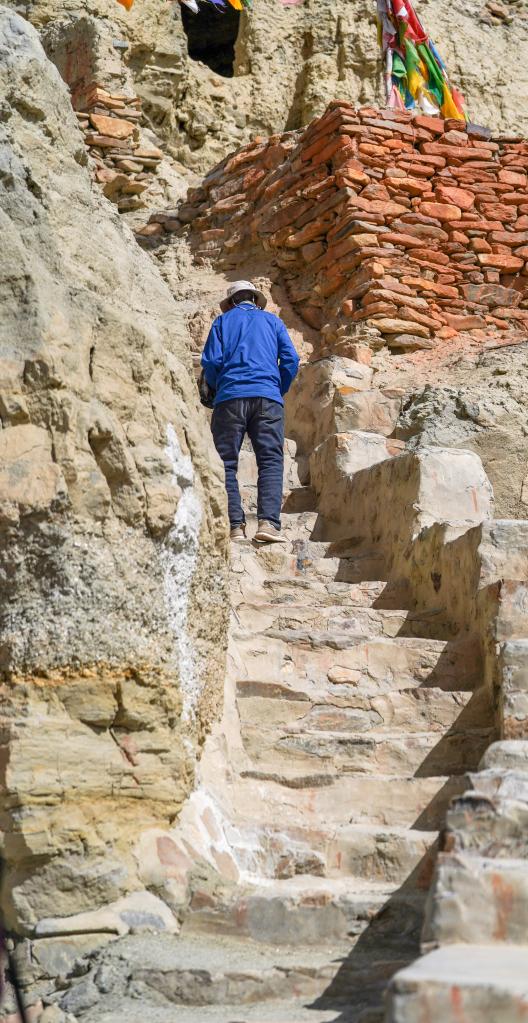 仁增旺扎老人的腿腳不便,每次從山腳登上石窟所在的山頂都需要耗費巨大的氣力。皮央和東嘎石窟遺址群所在的小山相對高差大概有150米左右,一共有400多級臺階,每一級臺階都非常陡峭,走路一搖一晃的仁增旺扎老人每次都要花半個小時多才能從山腳登上山頂。
