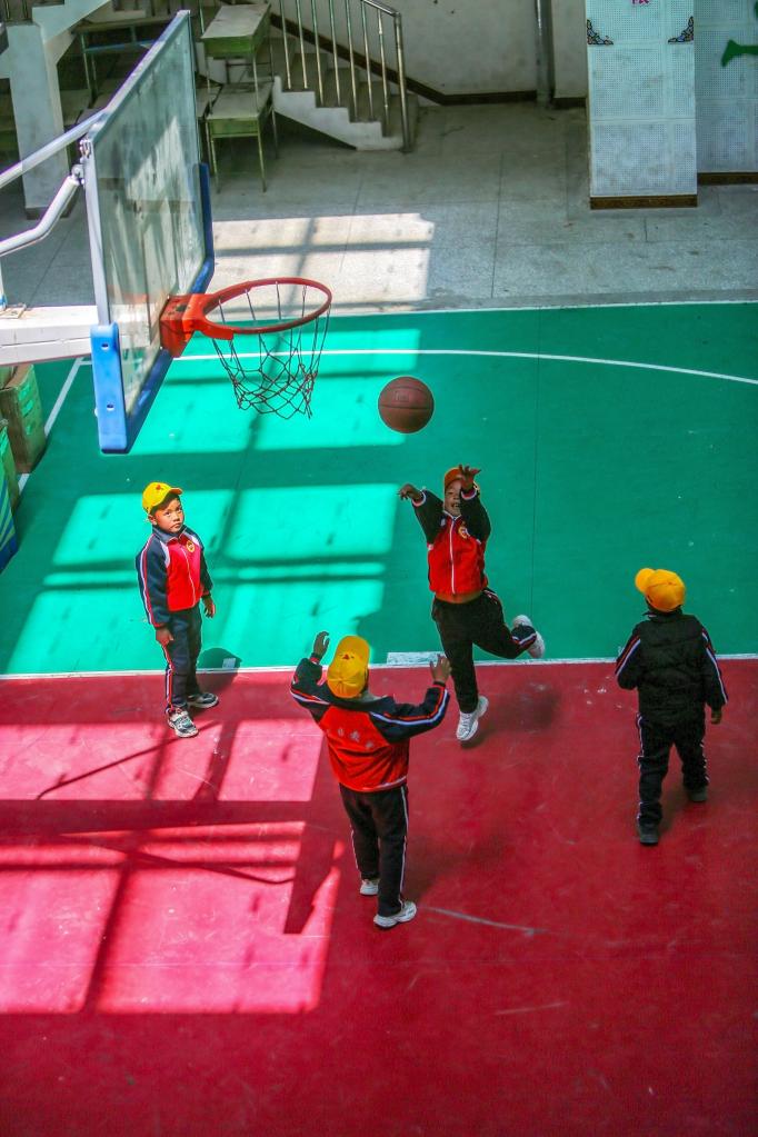 6月5日,扎西宗鄉(xiāng)完全小學學生在籃球課上投籃。