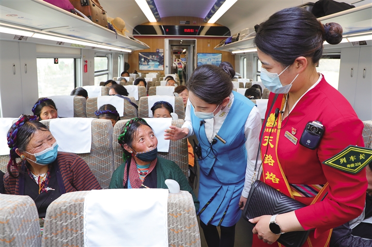 2022年初,青藏集團(tuán)有限公司在管內(nèi)各站、車開展“天路格?;ā逼放苿?chuàng)建以來,拉林鐵路各車站、各次列車上都能看到“天路格?;ā狈?wù)隊(duì)員,他們用真誠、熱情、熱心為每一位旅客提供溫馨細(xì)致的服務(wù)?!?月初,我?guī)е⒆觼砦鞑芈糜危?月20日前往林芝,游玩了三天,由于家里有事,不得不趕回去,就買了今天中午回拉薩的火車票,剛開車不久我姑娘就發(fā)燒,肚子痛。列車員看見孩子難受就詢問情況,并找來列車長周晶,通過廣播為我們找醫(yī)生,還好沒啥大事,就是腸胃感冒,我也就放心了。周晶車長也一直在旁邊幫我照顧孩子,拿濕毛巾擦臉,蓋毛毯,送來熱水,太細(xì)心了,讓我很感動(dòng)。她們工作認(rèn)真負(fù)責(zé),服務(wù)周到,我一路上都親身感受到了高原動(dòng)車的熱情?!痹?4日林芝到拉薩的C926次列車上,來自四川的高雅女士拉著記者激動(dòng)地說。