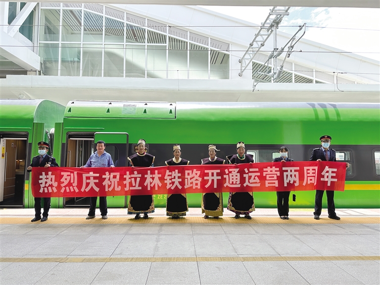 2021年6月25日,拉林鐵路開通運(yùn)營,結(jié)束了藏東南不通鐵路的歷史,復(fù)興號動(dòng)車開到西藏,駛上拉林鐵路,拉薩至山南、林芝最快1小時(shí)4分、3小時(shí)30分可達(dá);山南至林芝最快2小時(shí)22分可達(dá),相比汽車,從拉薩到林芝的時(shí)間幾乎節(jié)省了一半,從山南到林芝,也節(jié)省了2個(gè)多小時(shí)。兩年來,隨著運(yùn)行方式逐漸成熟,鐵路方便、快捷的運(yùn)輸優(yōu)勢逐步顯現(xiàn),客流持續(xù)攀升,青藏集團(tuán)有限公司及時(shí)根據(jù)客流情況在周末、節(jié)假日、寒暑假等客流高峰期增開281趟臨時(shí)旅客列車。兩年來,拉林鐵路共運(yùn)送旅客182.5萬人次,運(yùn)輸貨物41.91萬噸,拉近了藏東南地區(qū)9個(gè)城市的距離,也深刻改變了當(dāng)?shù)厝嗣竦墓ぷ骱蜕钣^念。