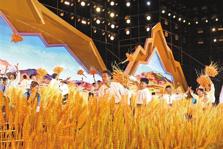 聲,是情的流露;舞,是意的表達(dá)。開幕式文藝表演由序《珠峰頌歌》、上篇《戀上青稞》、下篇《極境暢想》和尾聲《吉祥日喀則》組成。序《珠峰頌歌》中,150名演員深情合唱歌曲《珠穆朗瑪》,表演節(jié)奏歡快的男女踢踏舞等,展現(xiàn)日喀則高質(zhì)量發(fā)展的加速度和拼搏奮進(jìn)的精氣神。上篇《戀上青稞》,展示日喀則各族群眾勤勞、樂(lè)觀、向上的精神風(fēng)貌和獨(dú)具魅力的地域文化。下篇《極境暢想》,以青稞美酒作為表現(xiàn)載體,以游客的視角介紹日喀則文旅資源,并通過(guò)藏戲和昆曲等多種文化藝術(shù)碰撞,展示日喀則在打造面向南亞大通道的發(fā)展機(jī)遇中,廣泛開展對(duì)外開放交流合作。尾聲《吉祥日喀則》,展示日喀則海納百川、開放包容的胸襟和熱情。