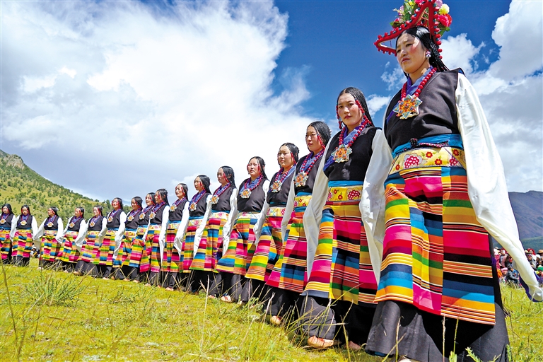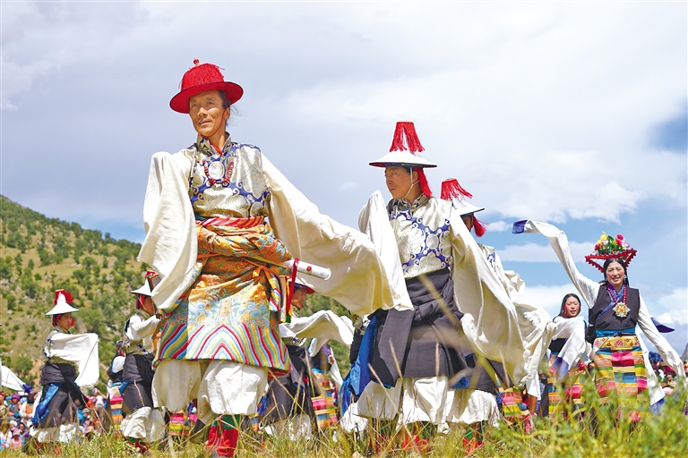 7月的林周縣唐古鄉(xiāng)綠草如茵,草地上點綴著藍色和黃色的野花。演員們以藍天白云為幕,伴隨著優(yōu)美的橫笛聲,跨出豪邁步伐,跳起了“熱振曲卓”?!盁嵴袂俊?,是林周人民智慧的結晶,在滄海桑田的變化中見證著這片土地的故事。