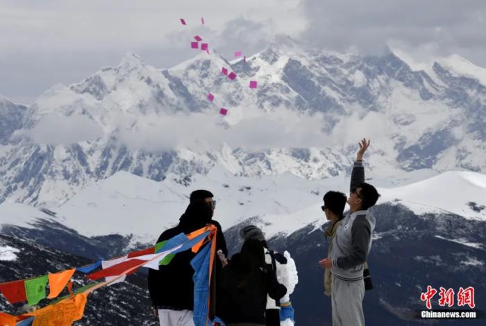游客在西藏林芝色季拉山觀景臺拋灑“隆達”(風(fēng)馬旗,藏族民眾的一種祈福方式)。李林 攝