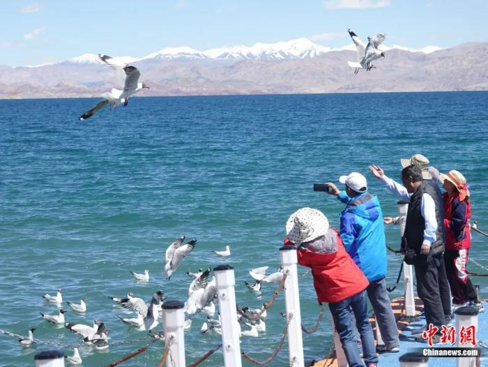 游客在班公湖邊拍攝棕頭鷗。班公湖位于西藏自治區(qū)阿里地區(qū)日土縣西北部,平均海拔4242米。這里景色優(yōu)美,水草豐茂,有眾多鳥類棲居于此。冉文娟 攝