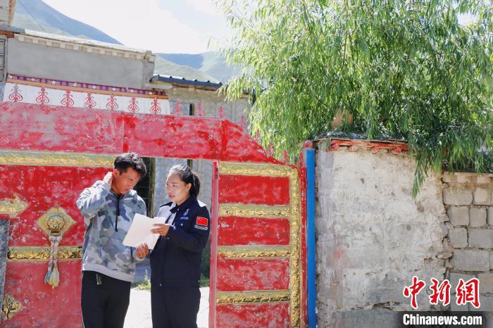 圖為索朗曲珍為鄰居解答戶籍辦理的相關(guān)政策?!?yīng)俊 攝