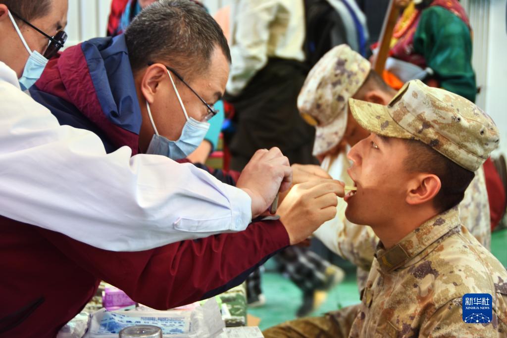 在阿里地區(qū),西安交通大學(xué)口腔醫(yī)院援藏醫(yī)生為解放軍戰(zhàn)士檢查牙齒(7月27日攝)。新華社 劉文博 攝