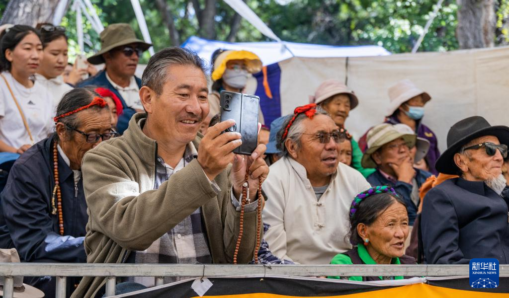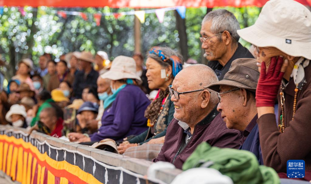8月19日,在拉薩市羅布林卡園林內(nèi),觀眾在觀看藏戲表演。新華社發(fā)(丁增尼達(dá)攝)