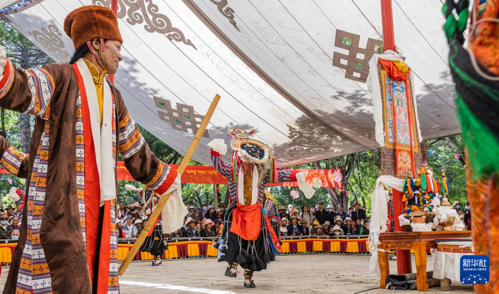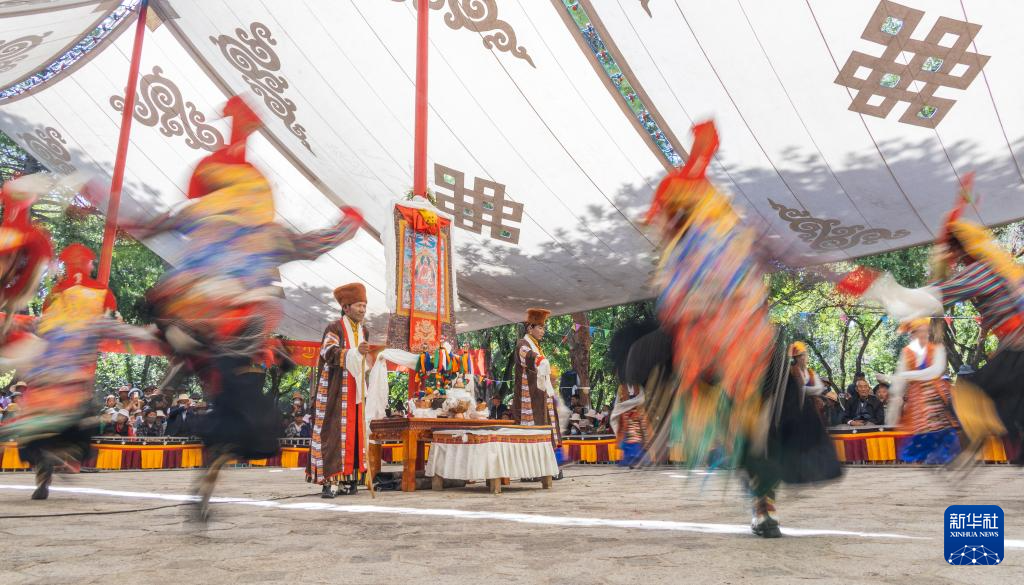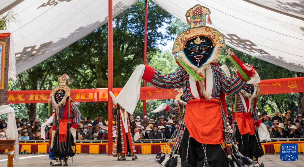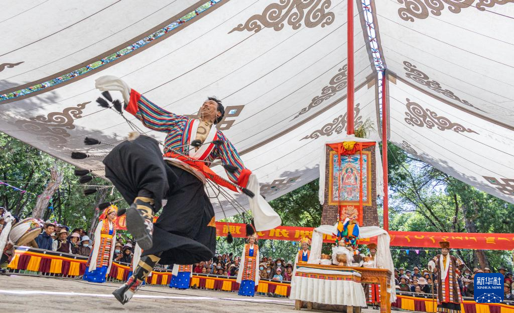 8月19日,在拉薩市羅布林卡園林內(nèi),貢嘎縣乃薩藏戲隊在表演藏戲《朗薩雯崩》。新華社發(fā)(丁增尼達(dá)攝)