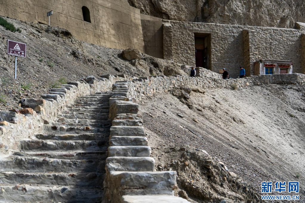 從遺址腳下一條蜿蜒的石頭路依山而建,一直延伸到洞窟門口?!斑@里以前沒有路,都是土坡?!卑⑼桌式榻B,以前想要到洞窟參觀,都得手腳并用爬上去。1998年,他開始推動修建山上的道路,號召東嘎村村民一起背著石頭上山,揮鋤挖土,用了幾年的時間才修成了如今的石頭路。