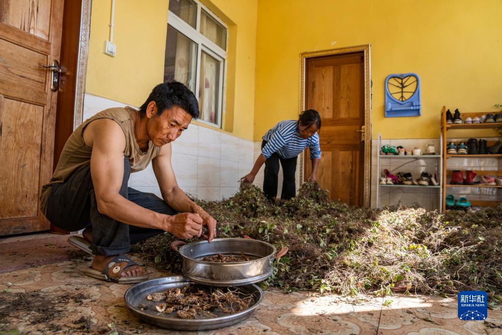 在西藏林芝市察隅縣,“采山人”在家中晾曬自己采集的林下作物(9月3日攝)。新華社發(fā)(丁增尼達(dá) 攝)