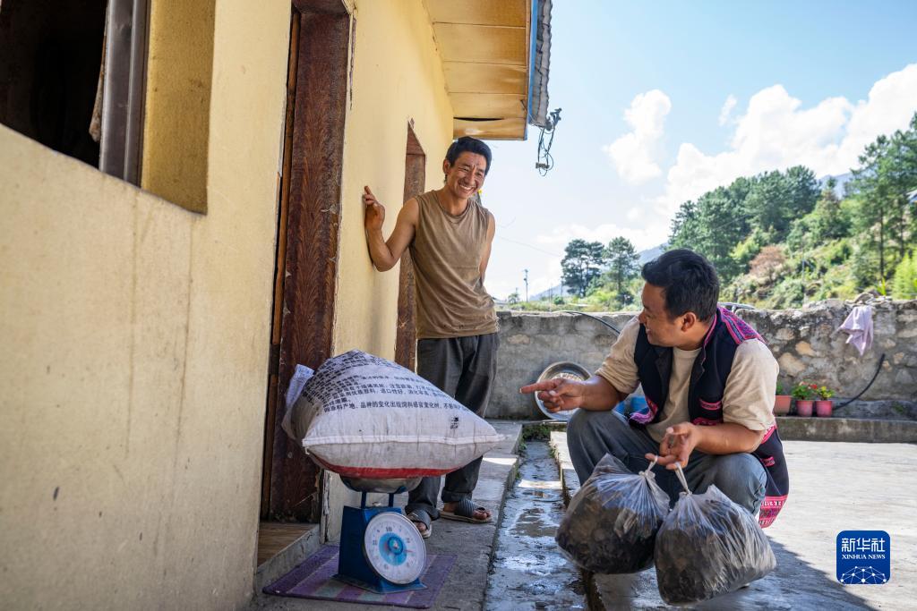 在西藏林芝市察隅縣,一名商販在收購“采山人”(左)采集的石耳(9月3日攝)。新華社記者 孫非 攝
