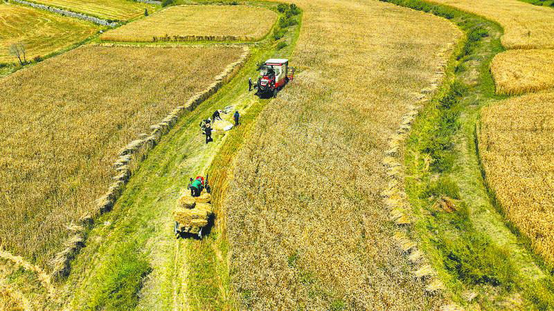 桑普村村民使用機械收割小麥。記者 阿旺尼瑪 攝