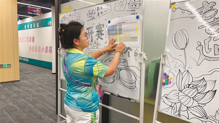配圖:“小青荷”索朗德吉在張貼賽區(qū)賽程表。記者 萬靖 攝