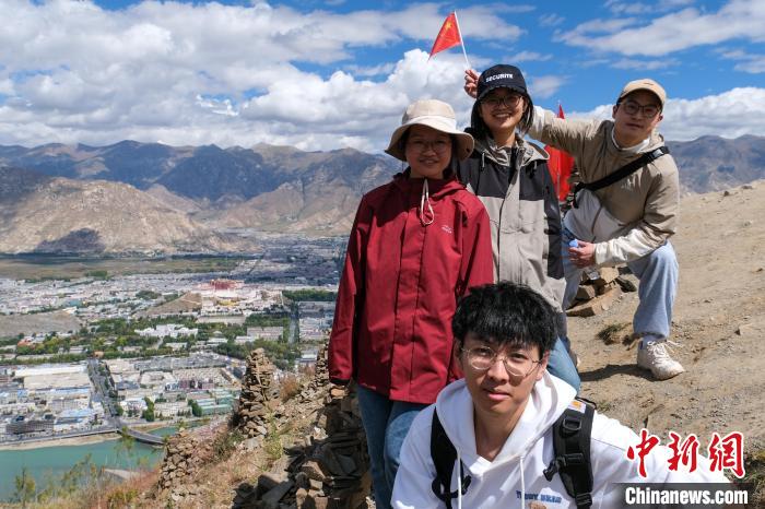 圖為9月28日,4位登山者在登上拉薩南山山頂后與遠處的布達拉宮合影留念。中新社記者 江飛波 攝