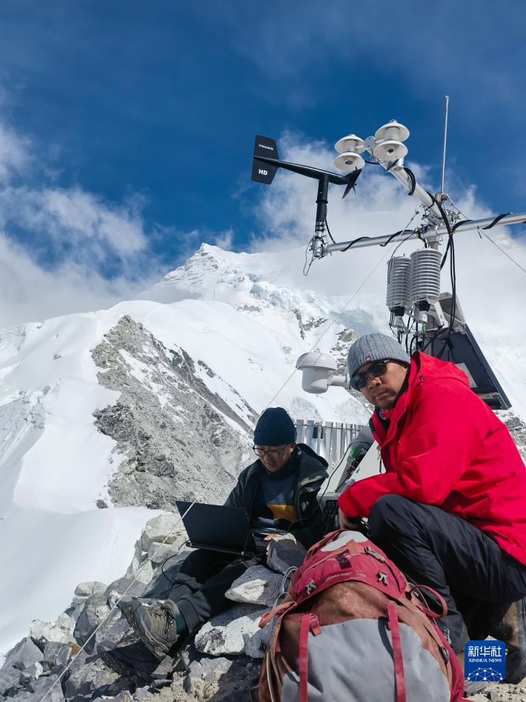 科考隊(duì)員在卓奧友峰峰頂架設(shè)自動(dòng)氣象站(10月1日攝)。新華社發(fā)(卓奧友峰科考隊(duì)提供)