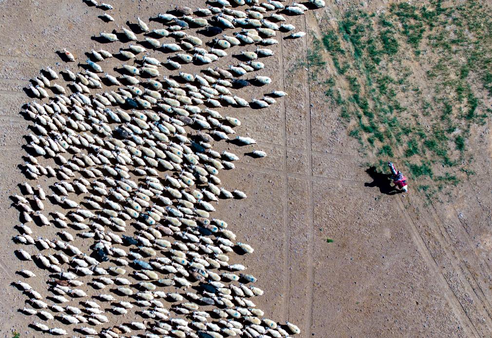 牧民在阿里地區(qū)日土縣班公湖畔放牧白絨山羊(無人機照片,9月21日攝)。新華社記者 姜帆 攝
