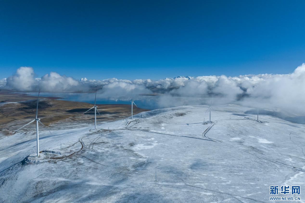 10月13日拍攝的西藏措美哲古風(fēng)電項(xiàng)目一處風(fēng)電機(jī)組(無人機(jī)照片)。新華網(wǎng) 旦增努布 攝
