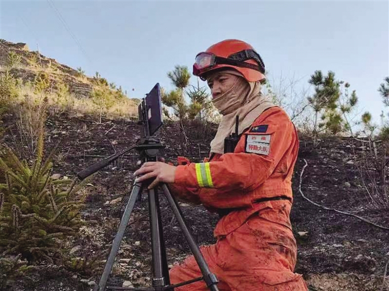 通信員在火場(chǎng)架設(shè)機(jī)位。