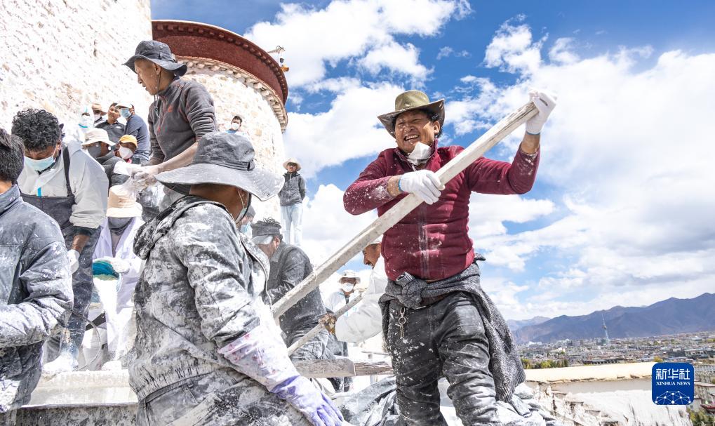 近日,西藏布達(dá)拉宮開(kāi)始進(jìn)行粉刷維護(hù)工作。為使經(jīng)過(guò)一年日曬雨淋的紅墻白壁保持鮮亮光彩,每年秋冬交替時(shí)節(jié),布達(dá)拉宮外墻都要進(jìn)行粉刷“美容”。