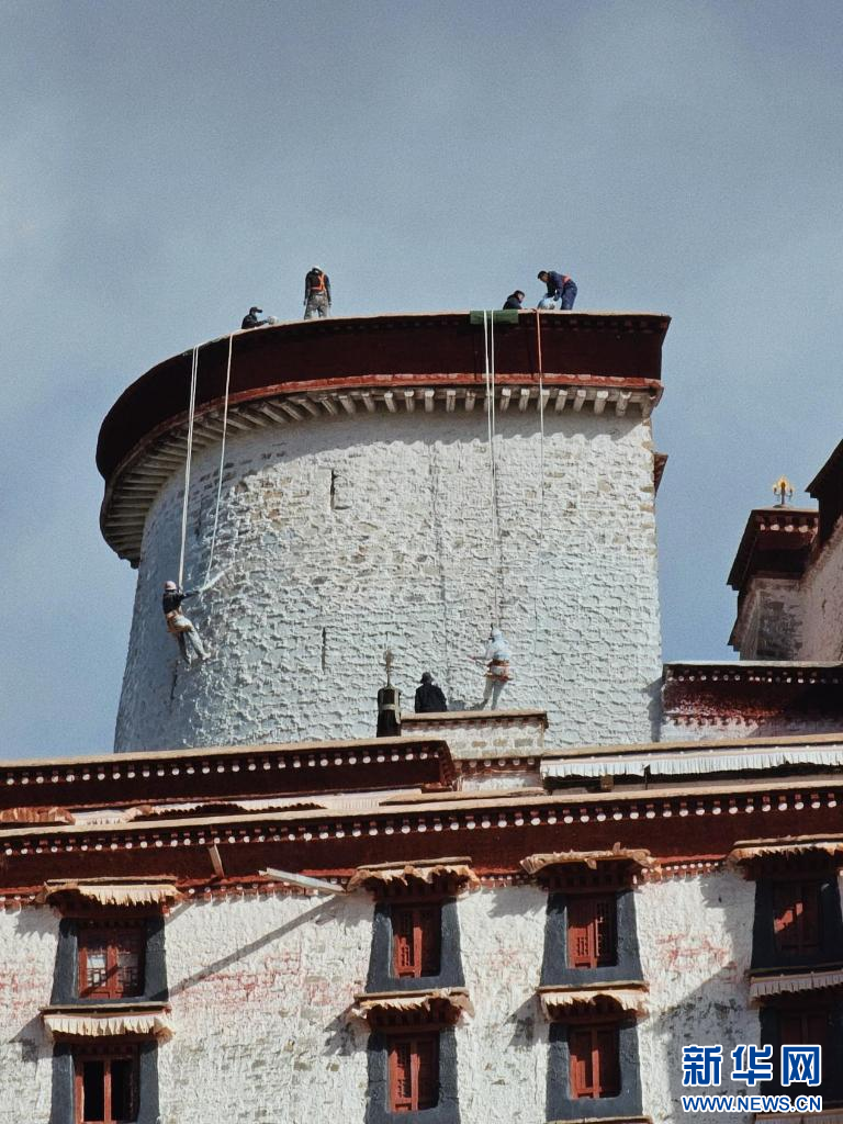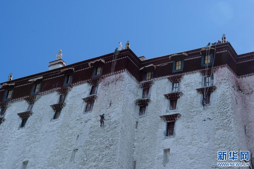10月18日,布達拉宮“美容師”們在噴灑外墻。新華網(wǎng) 柑丹鴦琦 攝