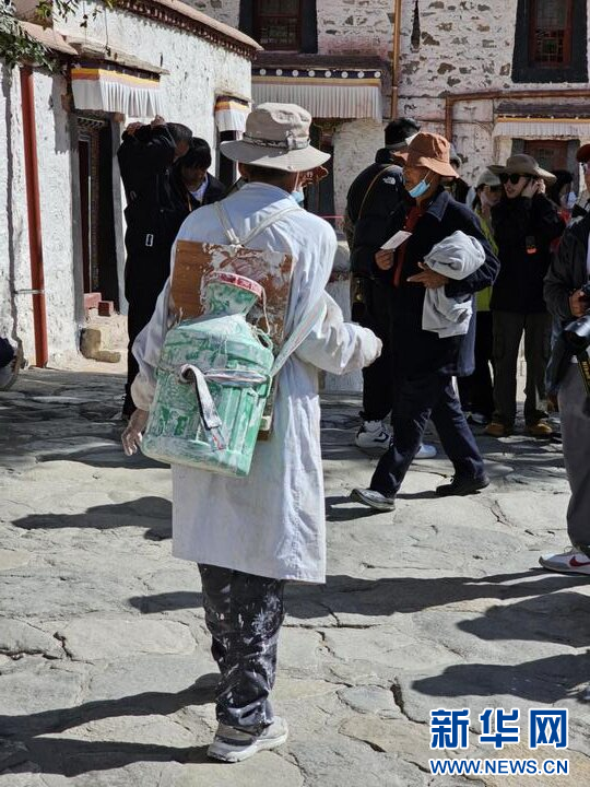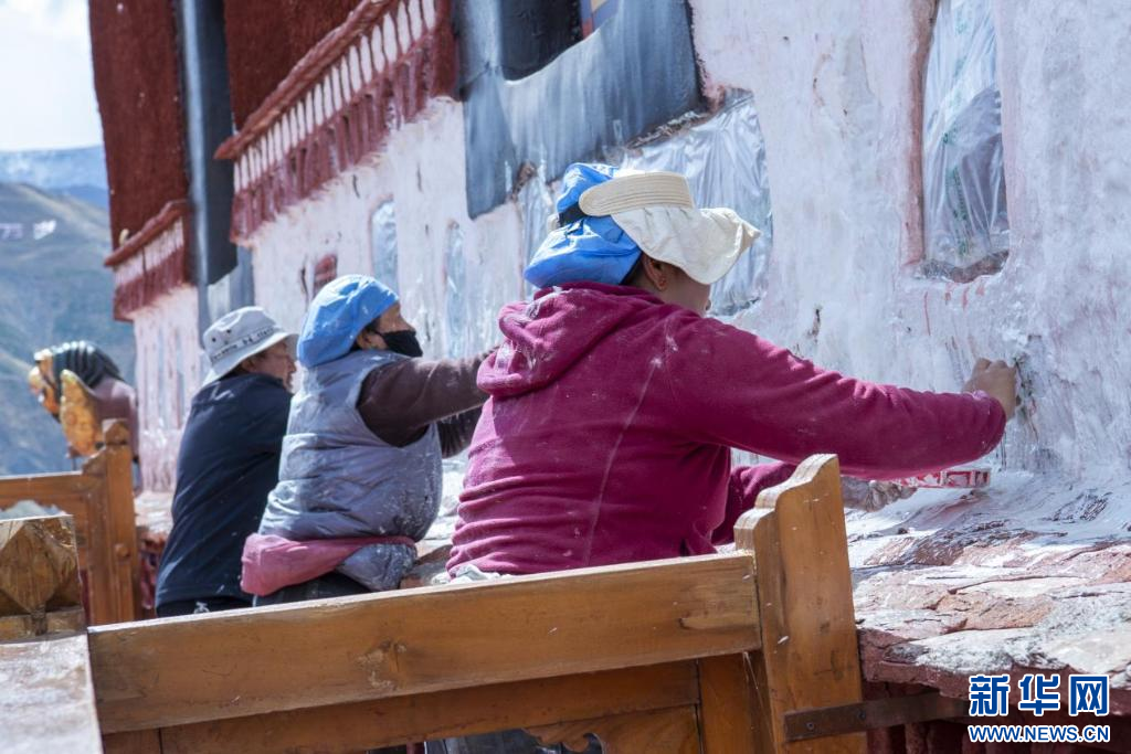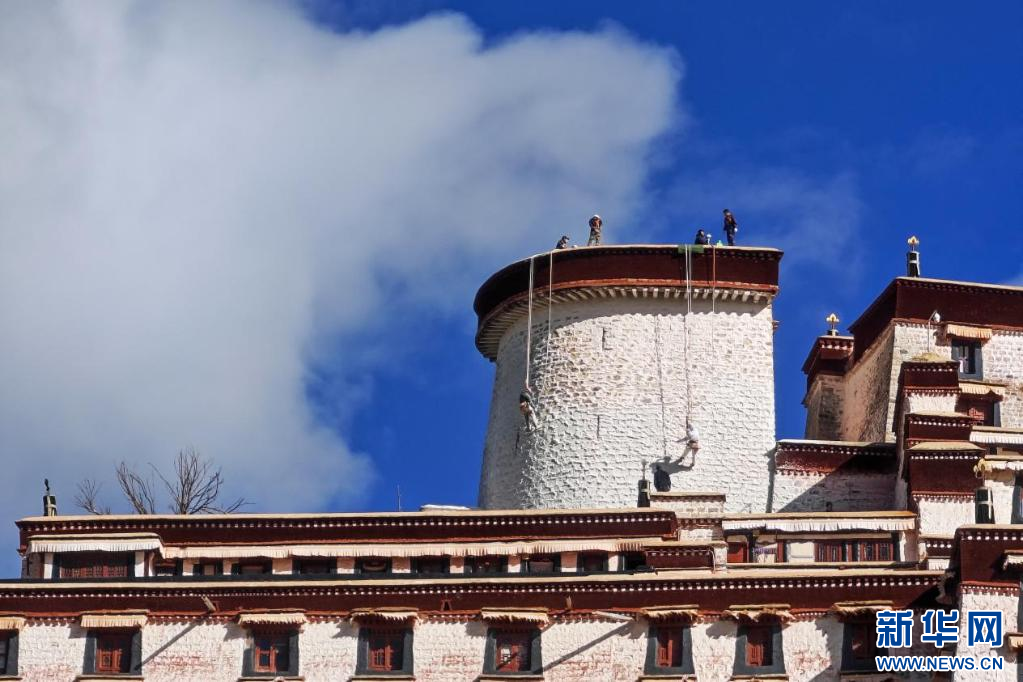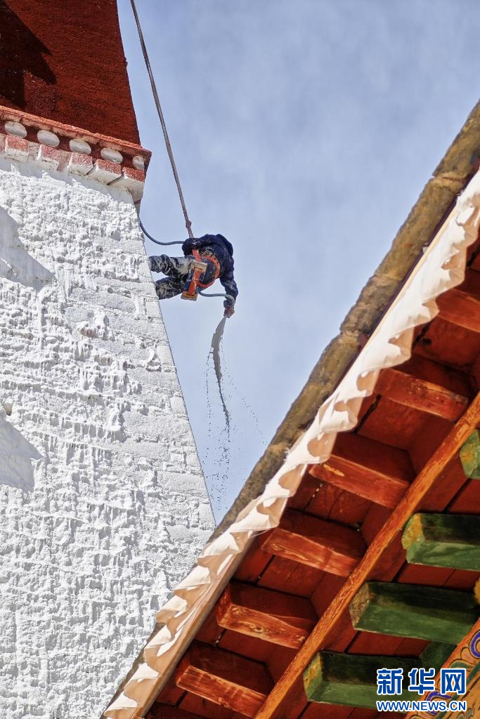 10月18日,布達拉宮“美容師”在噴灑涂料。新華網(wǎng) 柑丹鴦琦 攝