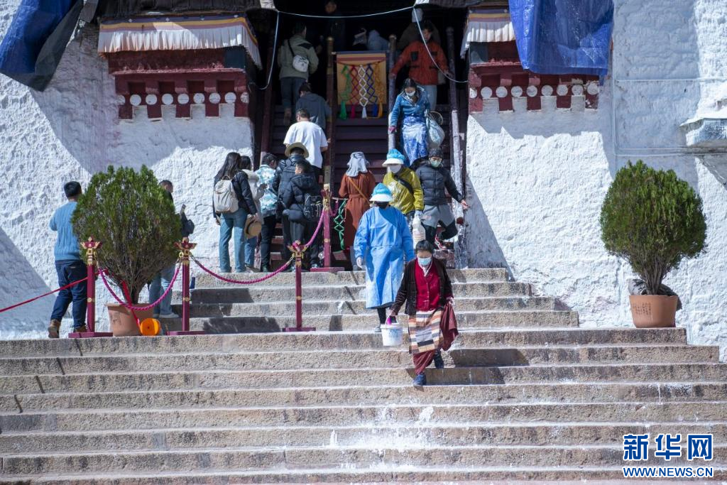 10月18日,布達拉宮“美容師”們在噴灑外墻。新華網(wǎng) 旦增努布 攝