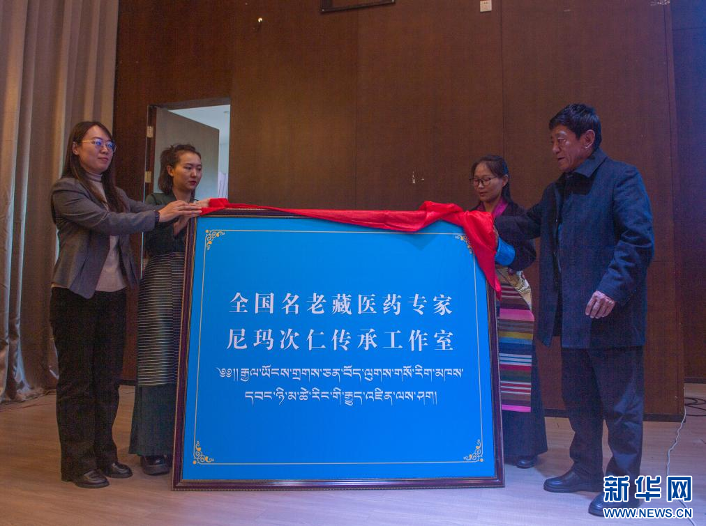 10月26日,西藏自治區(qū)藏醫(yī)藥管理局副局長王曉燕(左一)和岐黃學者、全國名老中醫(yī)藥專家尼瑪次仁(右一)共同揭牌傳承工作室。新華社記者 旦增尼瑪曲珠 攝