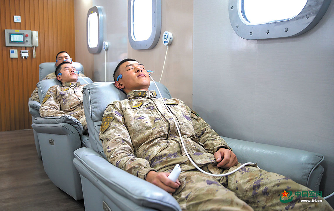 吃好每頓飯,在邊防部隊(duì)已不是新鮮事。對(duì)第一次走上高原的官兵來(lái)說(shuō),最擔(dān)心的是缺氧。筆者在海拔4700多米的某邊防連看到,剛走下哨位的戰(zhàn)士們進(jìn)入微壓氧艙進(jìn)行休整??戳艘粫?huì)兒書(shū),聽(tīng)了一會(huì)兒音樂(lè),幾名戰(zhàn)士很快便進(jìn)入夢(mèng)鄉(xiāng)。